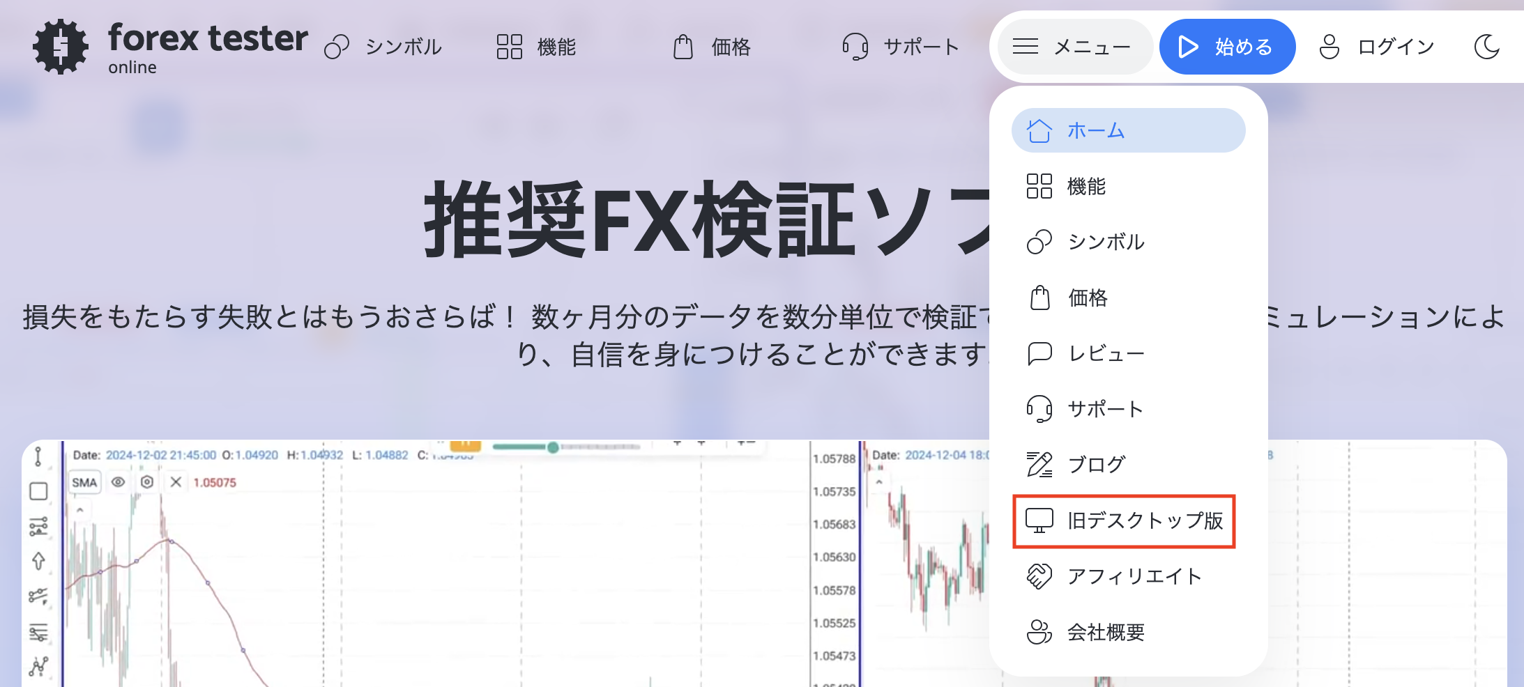 Mac PCだとForex Tester Onlineのホームページに転送される場合があります。その際は下図のとおりページ最上部にある「メニュー」の「旧デスクトップ版」をクリックすればデスクトップ版の公式サイトを開けます。