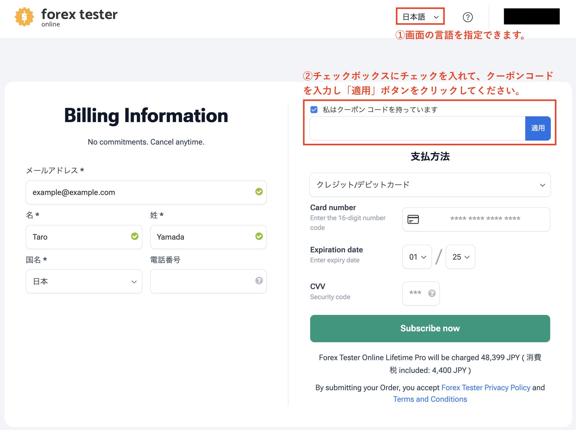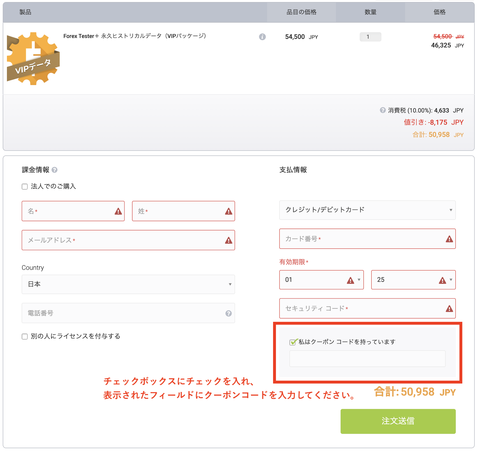 クーポンコードを使ってForex Tester Onlineを購入する手順